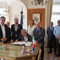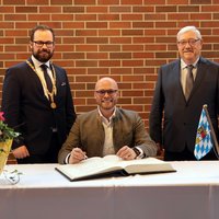 Bay. Staatsminister für Digitalisierung, Dr. Fabian Mehring, trägt sich ins Goldene Buch der Stadt Memmingen ein