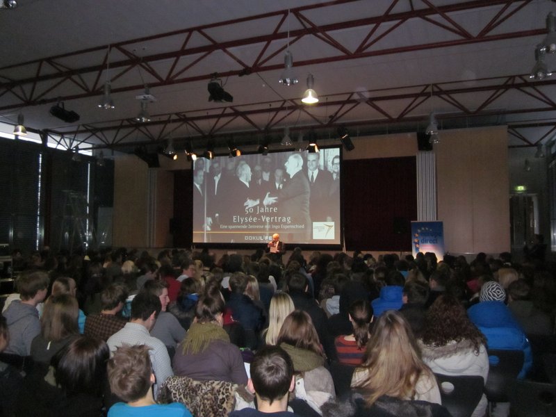Das Europabüro der Stadt Memmingen veranstaltete in Kooperation mit dem Cineplex und dem Vöhlin Gymnasium eine Live-Dokumentation zum Thema „50 Jahre Elysée Vertrag“. Der Vertrag feiert am 22.01.13 seinen 50. Geburtstag. Der Diplom Politologe Ingo Espenschied schilderte in spannender Art und Weise den Europafreunden im Cineplex und den ca. 500 Schülerinnen und Schülern im Vöhlin Gymnasium, wie der Staatsvertrag zwischen Deutschland und Frankreich zustande kam.