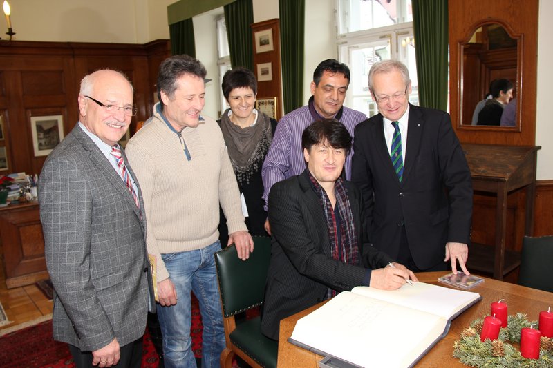 Andreas Fulterer beim Eintrag in das Goldene Buch der Stadt. Den Sänger umrahmen (von rechts) Oberbürgermeister Dr. Ivo Holzinger, sein Manager, der Memminger Francesco Abate, Christine Fulterer (Schwägerin), Johann Fulterer (Bruder) und Stadtrat Werner Häring vom Deutsch-Italienischen Freundeskreis. Foto: Pressestelle der Stadt Memmingen.