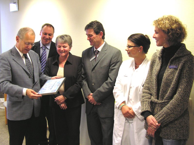 Weil im Klinikum Memmingen die Verordnung "Nichtraucherschutz" konsequent umgesetzt wird, erhielt es jetzt das Bronzezertifikat "Rauchfreies Krankenhaus". Im Kreise einer dafür ins Leben gerufenen Arbeitsgruppe übergab Oberbürgermeister Dr. Ivo Holzinger die Auszeichnung an Verwaltungschef Wolfram Firnhaber (unsere Aufnahme). Nur in ausgewiesenen Räumen bzw. Bereichen ist das Rauchen sowohl für die Patienten wie auch für die Mitarbeiter erlaubt. Darüber hinaus werden Patienten schon bei der Aufnahme auf die Schädigung durch das Rauchen hingewiesen. Auch die Mitarbeiter sind ausführlich auf die negativen Folgen des Tabakkonsums hingewiesen worden. Mit diesem Schritt möchte die Leitung des Klinikums deutlich machen, dass als Mitglied des Deutschen Netzes gesundheitsfördernder Krankenhäuser nicht nur Patienten wieder genesen sollen, sondern auch ihre Gesundheit aktiv gefördert wird. Angestrebt wird auch eine Lösung für die Raucher vor dem Eingangsbereich des Klinikums. Hier hat die Arbeitsgruppe einen konstruktiven Vorschlage vorgelegt, der laut Firnhaber realisiert werden soll. Im Mai 2003 wurde mit den Maßnahmen für ein rauchfreies Krankenhaus begonnen und im Juni vergangenen Jahres ein Antrag auf Vergabe des Zertifikates gestellt, dem jetzt entsprochen wurde. In Bayern gibt es neben Memmingen nur ein weiteres Krankenhaus (Cham) das eine entsprechende Auszeichnung erhielt; in ganz Deutschland sind es lediglich acht Häuser. Angestrebt wird jetzt das Silberzertifikat. Oberbürgermeister Dr. Ivo Holzinger dankte der Arbeitsgruppe für deren Engagement. Die vorliegende Urkunde sei ein weiteres Zeichen dafür, dass das Klinikum nicht nur in Bezug auf die Gesundheitsversorgung für die Bevölkerung Spitze sei, sondern auch in der Zusammenarbeit mit Mitarbeitern und Patienten ein gutes Beipiel gebe. Unsere Aufnahme zeigt von links: Oberbürgermeister Dr. Ivo Holzinger, Pflegedienstleiter Hans-Jürgen Stopora, Betriebsärztin Dr. Hildegard Schopper, Verwaltungschef Wolfram Firnhaber, Gynäkologin Dr. Elvira Burczyk und Ausbildungsleiterin Monika Katzer.