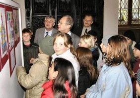 Das Rathaus zum Märchenschloss machten jetzt die Schülerinnen und Schüler der Klasse 5b der Lindenschule. Bürgermeister Hans Ferk, im Zivilberuf Lehrer und in dieser Klasse für den Kunstunterricht zuständig, war auf die Idee gekommen, das Memminger Rathaus von den Buben und Mädchen einmal so in Bildern darstellen zu lassen, wie sie es sich in ihrer Fantasie vorstellen. Die Kinder wiederum machten es dann zum Schloss von König „Ivo“. Zusammen mit Klassenlehrerin Ulrike von Castell und Rektor Werner Habereder stellte der Nachwuchs seine kleinen Kunstwerke am Dienstag dem Oberbürgermeister in der Rathaushalle vor. Dr. Ivo Holzinger zeigte sich erfreut über den künstlerischen Beitrag der Kinder und ließ sich von ihnen Einzelheiten erklären. Im Bildhintergrund von links: Hans Ferk, Dr. Ivo Holzinger und Werner Habereder.