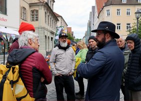 Oberbürgermeister Jan Rothenbacher ließ es sich nicht nehmen, mit den Teilnehmerinnen und Teilnehmern der Tafel ins Gespräch zu kommen. „Demokratie findet immer statt, auch bei schlechtem Wetter“, betonte das Stadtoberhaupt. „Es ist schön zu sehen, dass die FREIheitstafel als Ort des Miteinanders und des Austauschs angenommen wird.“