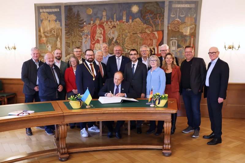Seit dem Jahr 2009 besteht die Städtepartnerschaft zwischen Memmingen und der ukrainischen Stadt Tschernihiw. Sehr viel länger schon sind beide Städte durch vielfältige Kontakte in der Bürgerschaft miteinander verbunden. Seit dem Beginn des russischen Angriffskriegs im Februar 2022 liegt Tschernihiw mitten im Kriegsgebiet. Auf Einladung des CSU-Fraktionsvorsitzenden im Bayerischen Landtag, Klaus Holetschek, kam Yurii Nykytiuk, Generalkonsul der Ukraine in München, nach Memmingen und besuchte auch Unternehmen in der Region. Im Rathaus trug sich der Generalkonsul ins Goldene Buch der Stadt ein und berichtete von der aktuellen Lage in der Ukraine. „Wir freuen uns sehr über Ihren Besuch in Memmingen. In Gedanken sind wir bei unseren Freunden in Tschernihiw“, hieß Oberbürgermeister Jan Rothenbacher den Generalkonsul in Memmingen willkommen.