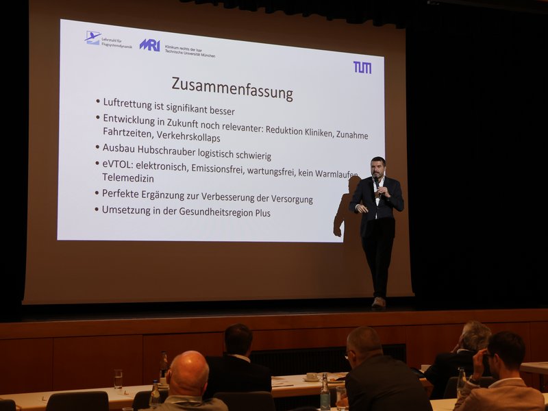 Der Bedarf der Medizin treffe auf eine weit fortgeschrittene Entwicklung elektrischer Antriebe, hohe Energiedichte von Batterien, auf hochentwickelte Sensoren und moderne Fertigungsmethoden, erläuterte Prof. Dr. Florian Holzapfel. „Es wird aktuell weltweit an eVTOLs entwickelt. Wir können heute Flugzeuge deutlich leichter bauen als vor 20 Jahren bei einer deutlich geringeren Komplexität. Was mich an unserem eVTOL für medizinische Transporte besonders freut: Die Lösung kommt aus Bayern“, machte der Experte in Flugsystemdynamik auf den Entwicklungsstandort in Ottobrunn bei München aufmerksam. Ein großer Vorteil des eVTOLs gegenüber dem Hubschrauber seien die deutlich geringeren Herstellungs- und Wartungskosten.