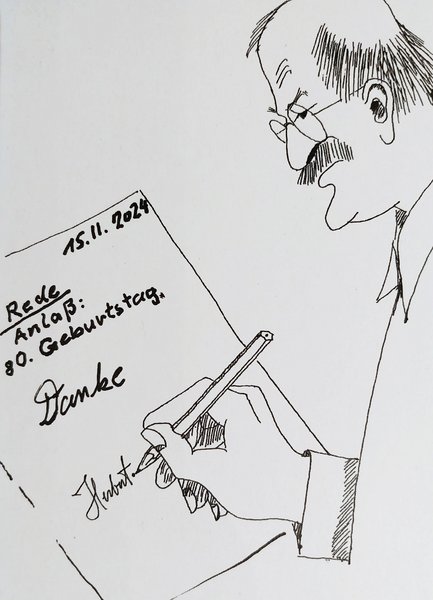 Herbert Müller rief in seiner Dankansprache ihm wichtige Momente seines Lebensweges in Erinnerung, etwa als er seine Frau Renate kennen lernte, als er das KZ Auschwitz besuchte oder seine Arbeit als parlamentarischer Geschäftsführer der SPD-Landtagsfraktion aufnahm. Herbert Müllers wichtigste Botschaft an die Gäste der Feierstunde zu seinem 80. Geburtstag hielt er in einer Zeichnung fest: ein schlichtes „Danke“.