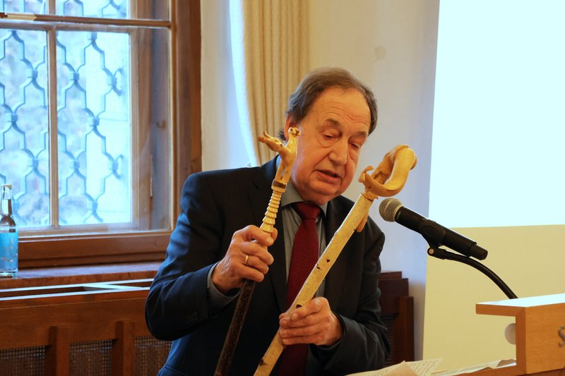 Als Kunstlehrer war Herbert Müller von 1966 bis 1984 an der Bismarckschule tätig und immer war er auch selbst künstlerisch aktiv, erklärte Bürgermeister Dr. Hans-Martin Steiger, der Herbert Müllers weniger bekannte Seite des Kunstschaffenden vorstellte. Als Geschenk erhielt der Jubilar einen schönen Stamm Lindenholz aus dem Stadtwald, aus dem er seine umfangreiche Sammlung an kreativ geschnitzten Gehstöcken erweitern kann.