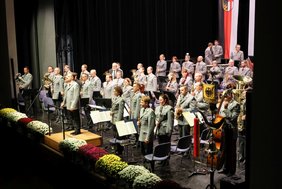Dabei gab das Blasorchester schon mit dem ersten Stück einen äußerst festlichen Rahmen vor. Nicht nur beim Festmarsch von Richard Strauss, auch beim San Lorenzo Marsch von Caetano Silva beeindruckten die Musikerinnen und Musiker quasi mit Pauken und Trompeten. Aber auch die leisen Töne beherrscht das Ensemble. Gut zu hören bei der Carmen Suite, nach der weltberühmten Oper von Bizet, hier in einer Bearbeitung von François Borne, bei dem Hauptfeldwebel Meike Tappert kongenial an der Querflöte ihr Können zeigte.