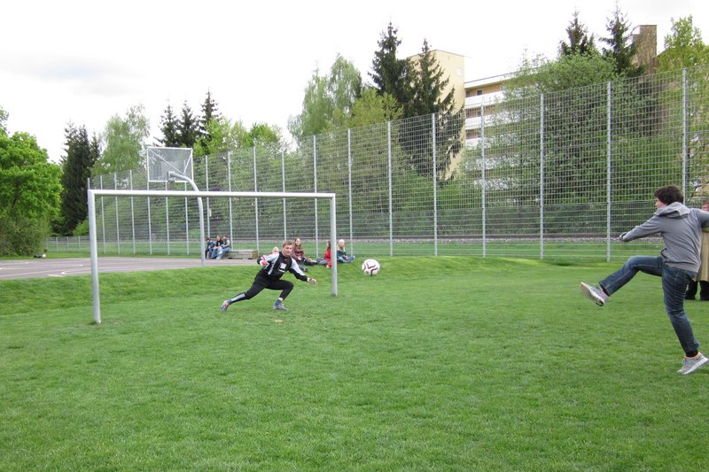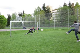 Nachdem der Spielplatz offiziell seiner Bestimmung übergeben wurde, nahmen die Kinder und Jugendlichen mit viel Freude die Spielgeräte in Beschlag. Die Quartiersmanagerinnen Katrina Dibah-Lavorante und Isabel Schötta vom Projektbüro Soziale Stadt hatten in Kooperation mit dem FC Memmingen und dem Jugendzentrum Splash ein buntes Eröffnungsprogramm mit Korbwerfen und Fußball organisiert. Höhepunkt war das Elfmeterschießen mit Thomas Reichart, 2. Vorsitzender des FC Memmingen und ehemaliger Torwart des Vereins. Die Kinder und Jugendlichen wurden nicht müde, ihre Treffsicherheit zu testen, und hatten auf dem neuen Rasenfeld einen Riesenspaß.