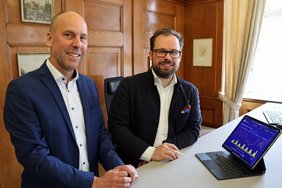 Oberbürgermeister Jan Rothenbacher und LEW-Kommunalbetreuer Andreas Bayer (l.) verfolgen aufmerksam die Daten des Energiemonitors für Memmingen (Foto: Alexandra Wehr/ Pressestelle Stadt Memmingen)