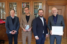 Amtsübergabe im städtischen Kulturamt: Hans-Wolfgang Bayer (r.) erhielt zum Abschied ein Werk des Künstlers Uwe Langmann. Als Nachfolger im Amt begrüßten Oberbürgermeister Jan Rothenbacher und Bürgermeister Dr. Hans-Martin Steiger (l.) den 45-jährigen Kulturwissenschaftler Sebastian Huber (2.v.l.). (Foto: Alexandra Wehr/ Pressestelle Stadt Memmingen)