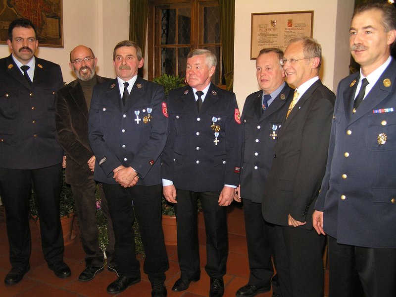 Unser Bild zeigt die Ehrung der Feuerwehrmänner, welche bereits 40 Jahre lang Dienst leisten (v.l.n.r.): Wolfgang Bauer (Stadtbrandinspektor), Helmut Börner (Feuerwehrreferent des Stadtrates), Johannes Honold und Hermann Kächler (beide 40 Jahre Feuerwehr Buxach), Herbert Campagna (40 Jahre Feuerwehr Steinheim), Oberbürgermeister Dr. Ivo Holzinger und Stadtbrandrat Hans Hirschmeier.