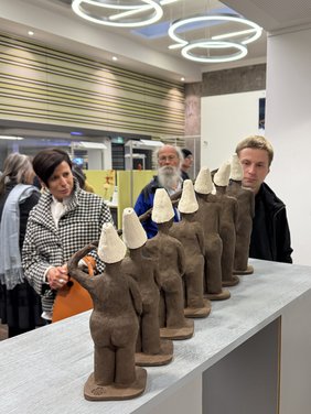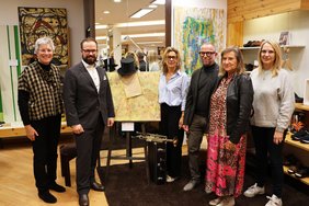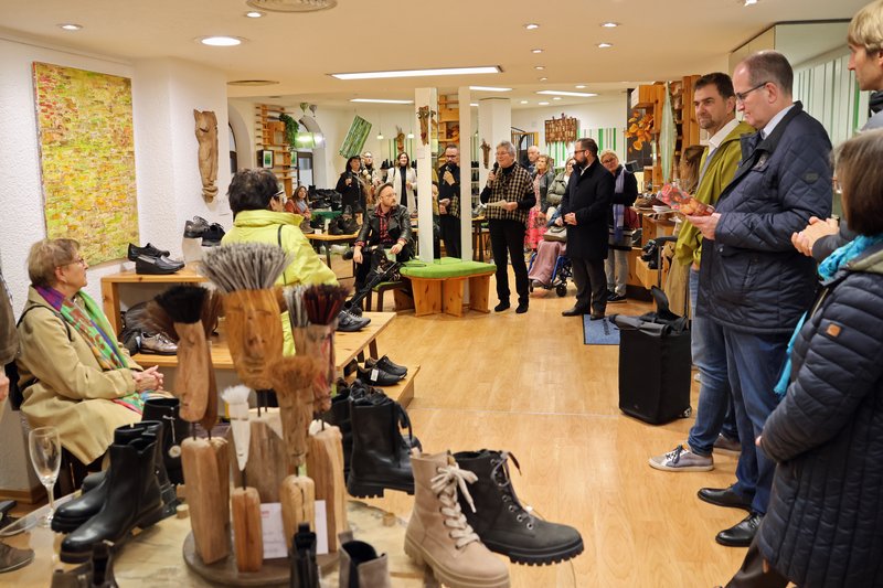 Das Schuhhaus Cornelius in der Kalchstraße ist bis Ende Oktober Schuhgeschäft und auch Ausstellungsraum für Werke des Künstlerehepaars Petra und Dietmar Siegl. Wer dort nach neuen Schuhen schaut, kann zugleich auch Acrylmalerei und Holzskulpturen der Memminger Kunstschaffenden entdecken. Denn das Schuhhaus ist eines von 51 teilnehmenden Geschäften, Behörden und Dienstleistungsunternehmen, die heuer an der Aktion „Kunst im Geschäft“ der Stadt Memmingen und des Stadtmarketingvereins Memmingen e.V. teilnehmen. Oberbürgermeister Jan Rothenbacher dankte bei der Eröffnung allen Unternehmerinnen und Unternehmern und den Kunstschaffenden für ihre Teilnahme und die intensiven Vorbereitungen und Abstimmungen, die die beliebte Aktion „Kunst im Geschäft“ zu einem ganz besonderen Erlebnis werden lasse.