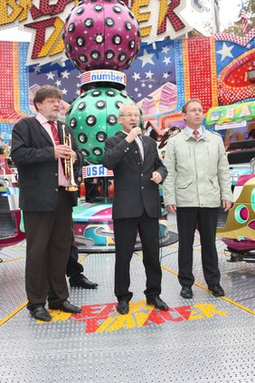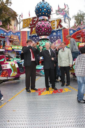 Traditionell mit einem Trompetenständchen eröffnete der Marktreferent Rolf Spitz den Memmminger Jahrmarkt. Oberbürgermeister Dr. Ivo Holzinger ließ es sich wie immer nicht nehmen, Fahrgeräte zum Start selbst zu testen.