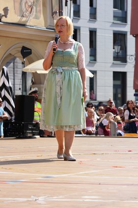 Die Mädchen und Buben der Memminger Grund- und Förderschulen konnten ihr Kinderfest bei bestem Wetter feiern. Strahlenden Sonnenschein gab es bereits zum Weckruf der Kapellen in den Ortsteilen. Danach stand der Besuch der Gottesdienste an und der sternförmige Einzug der verschiedenen Schulen auf dem Marktplatz. Nach der traditionellen Eröffnung durch die Trommlerbuben und –mädchen begrüßte Dagmar Trieb, die Vorsitzende des Kinderfestausschusses, die anwesenden Kinder und deren Eltern und Großeltern, die sich neben zahlreichen weiteren Besucherinnen und Besuchern ebenfalls am Marktplatz eingefunden hatten.