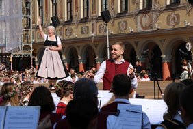 Musikschulleiterin Konstanze Kraus und Stadtkapellmeister Markus Peter beim Lied "Wir sind Kinder einer Welt".