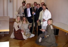 Darauf machten bei einer Sitzung des schwäbischen Städtetages in Memmingen Oberbürgermeister Dr. Ivo Holzinger, Memmingen, Städtetagssprecher für die kreisfreien Städte, Regierungspräsident Ludwig Schmid, Städtetagssprecher für die kreisangehörigen Städte, Gerd Bischoff, Immenstadt, der bayerische Städtetags-Präsident Josef Deimer und Dr. Helmut Schwinghammer, geschäftsführendes Vorstandsmitglied des bayerischen Städtetags (von links) mit der Bettlergruppe des Memminger Fischertagsvereins, welche ebenfalls bei den im Juli stattfindenden Wallensteinspielen in Memmingen aktiv sind, aufmerksam.