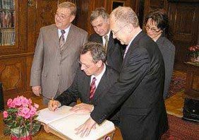 Seinen Antrittsbesuch im Memminger Rathaus machte jetzt der neue bayerische Kultusminister Siegfried Schneider. Willkommen geheißen wurde er dabei von Oberbürgermeister Dr. Ivo Holzinger. Dieser erläuterte die Intentionen der Stadt zur Verstaat-lichung der Sebastian-Lotzer-Realschule. Schneider zeigte sich durchaus aufge-schlossen, verwies jedoch auf die Finanzlage im Freistaat und auf die installierte Arbeitsgruppe im Kultusministerium, welche sich mit der Verstaatlichung kommunaler Schulen befasst. Im Anschluss an das Gespräch trug sich Kultusminister Siegfried Schneider (sitzend) in das Goldene Buch der Stadt Memmingen ein.