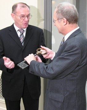 "Sie ist großartig geworden und sie gibt ein entscheidendes Signal nach vorne." So bilanzierte Oberbürgermeister Dr. Ivo Holzinger die Sanierung der MEWO Kunsthalle, die jetzt von der Memminger Wohnungsbau eG (MEWO) an die Stadt übergeben wurde. Der Augenblick der Schlüsselübergabe sei eine neue Ära für das historische Gebäude, so der geschäftsführende Vorstand Hans-Peter Knechtel. Investiert wurden in die Sanierung rund 4,5 Millionen Euro. Das über 200 Jahre alte Gebäude diente über 80 Jahre lang als Postamt, von 1990 bis 1996 war es Domizil des Landgerichts, das während dieser Zeit umgebaut wurde, und von 1999 bis 2000 nutzte es die Deutsche Bahn AG als provisorisches Bahnhofsgebäude. Die Kunsthalle beherbergt als Dauerausstellungen die heimischen Maler Josef Madlener und Max Unold. Zusätzliche Wechselausstellungen sollen ab 2006 das Interesse der Bevölkerung wach halten. Unsere Aufnahme zeigt die Schlüsselübergabe von Hans-Peter Knechtel an Oberbürgermeister Dr. Ivo Holzinger. Wie groß das Interesse der Bevölkerung an der neuen kulturellen Einrichtung ist, verdeutlichen einige Zahlen. Zum Eröffnungsabend kamen 500 Besucher. An den beiden folgenden Tagen der offenen Tür (Samstag und 1. Adventssonntag) wurden rund 6 000 Interessenten gezählt.