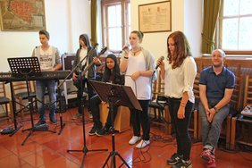 Einen symbolischen Scheck über 8.500 Euro erhielt Harald Rehklau, Direktor der Städtischen Realschule, für eine Überholung des Flügels der Schule. „Dass Ihre Schulband richtig gut ist, haben wir gerade gehört. Nun soll auch Ihr Flügel wieder gut klingen“, erklärte Stefan van Dorsser, Betriebsleiter des Krematoriums Memmingen. Die Schulband der Sebastian-Lotzer-Realschule unter der Leitung von Stephan Winkler gestaltete die Feierstunde im Rathaus mit peppigen Songs. Der Flügel, erläuterte Rehklau, sei zur Einweihung der Realschule 1968 angeschafft worden. Nun soll er, mit Hilfe der Spende komplett überholt, auch bei der Eröffnung des neuen Schulgebäudes Ende Juli gespielt werden.
