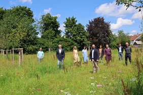 Die Auswahl der Obstbäume hat das städtische Amt für Stadtgrün und Friedhöfe getroffen, das auch die langfristige Pflege von Bäumen und Wiese übernimmt. „Wir haben einige alte Sorten gepflanzt, um zu deren Erhalt beizutragen, beispielsweise den Pfaffenhofer Schmelzling, den Kaiser Wilhelm Apfel oder den Rheinischen Bohnapfel. Es sind interessante und ertragreiche Sorten, auch eine Birne mit rotem Fruchtfleisch ist darunter“, erklärt Amtsleiter Michael Koch. Schilder an den einzelnen Bäumen sollen in Zukunft Auskunft über die jeweilige Sorte geben. Eine wichtige Botschaft hat der Obstbaum-Fachmann für alle, die im Herbst ernten werden: „Bitte gehen Sie behutsam mit Bäumen, Wiese und Tieren um!“