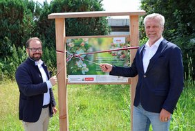 Pfirsiche, Pflaumen, Esskastanien, Birnen und Äpfel wachsen auf einer neu angelegten Streuobstwiese an der Erfurter Straße im Memminger Westen. Das Projekt konnte durch finanzielles Engagement, Maschinenpark und Manpower der KUTTER Bauunternehmung und durch das Team des Amts für Stadtgrün und Friedhöfe umgesetzt werden. „Wir freuen uns über die tolle neue Streuobstwiese und dass wir sie dank der KUTTER Bauunternehmung realisieren konnten. Hier wird über die Jahre wertvoller Lebensraum für Wildbienen, Vögel, Schmetterlinge und viele andere Arten entstehen“, betonte Oberbürgermeister Jan Rothenbacher bei einem Besuch der Streuobstwiese, bei dem auch ein Schild mit Erklärungen und Pflückregeln enthüllt wurde. „Den Memmingerinnen und Memmingern wünsche ich im Herbst viel Freude beim Ernten“, bekräftigte OB Rothenbacher.
