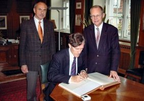 Oberbürgermeister Dr. Ivo Holzinger und Wirtschaftsförderer Hermann Schneider stellten Memmingen als dynamischen und etablierten Standort in Schwaben vor. Als Geschenk überreichte der Diplomat einen Regenschirm, welcher aus Anlass der niederländischen EU-Ratspräsidentschaft entworfen wurde.