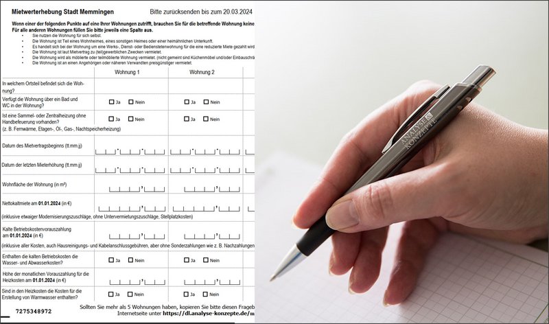 Die Firma Analyse & Konzepte immo.consult GmbH erstellte ein Konzept, das die aktuellen Verhältnisse des Memminger Wohnungsmarkts wiedergibt. In der vorgenannten Sitzung des Kultur-, Bildungs- und Sozialausschuss wurde das Konzept im Detail vorgestellt. Die Bestands- und Neuvertragsmieten wurden bei Wohnungsunternehmen und bei rund 1800 privaten Vermietern erfragt und Angebotsmieten in Inseraten, veröffentlichten Mietwohnungsangeboten, in Immobilienbörsen und Internetportalen erhoben. Rund 43 Prozent des relevanten Mietwohnungsbestands konnten demnach insgesamt erhoben werden.