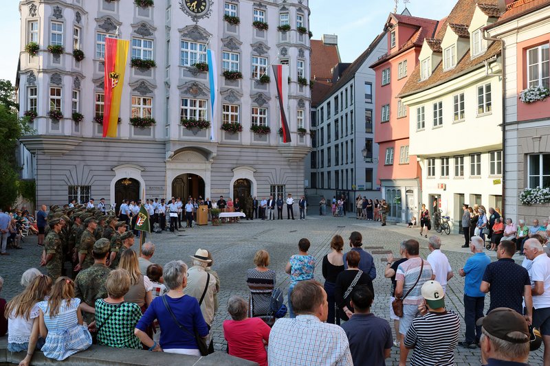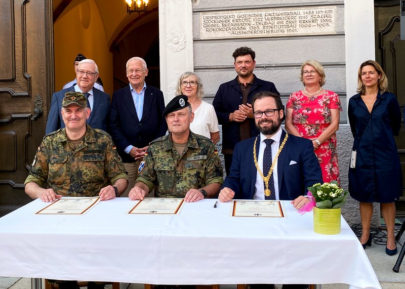 Bei einem feierlichen Festakt auf dem Marktplatz unterzeichneten Oberbürgermeister Jan Rothenbacher, Oberst Markus Wick, Kommandeur Heimatschutzregiment 1, und Oberstleutnant Heiko Schnitzler, Kompaniechef 9./Heimatschutzregiment 1 die Patenschaftsurkunde für die Heimatschutzkompanie.