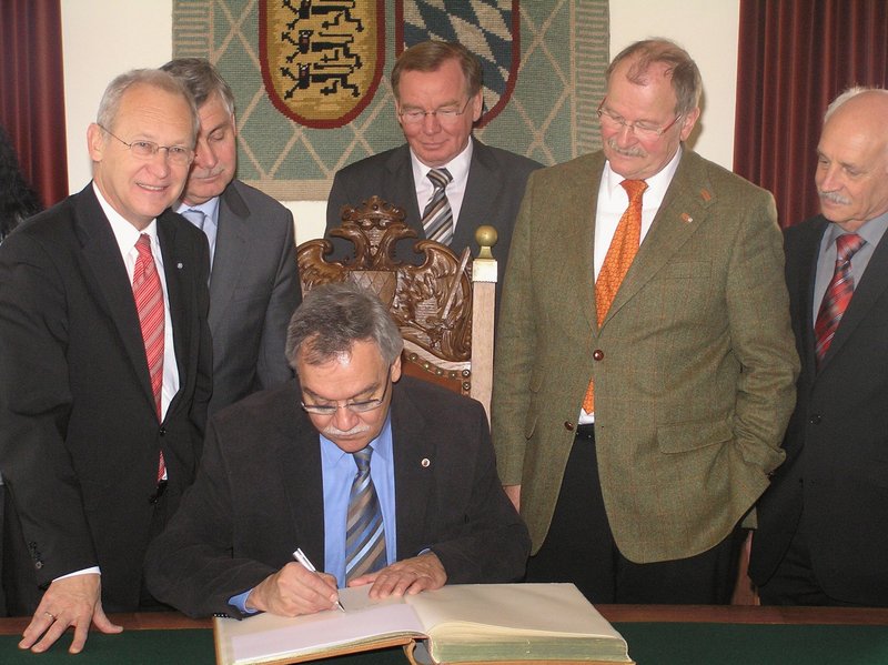 „Sie haben aber ein schönes Rathaus“, begrüßte Karl Peter Bruch Oberbürgermeister Dr. Ivo Holzinger im Sitzungssaal des Rathauses. Memmingens Oberbürgermeister hieß den Gast aus Rheinland-Pfalz herzlich willkommen und überreichte ihm einen Bildband der Stadt. Nach einem Rückblick in die Geschichte der ehemals freien Reichsstadt Memmingen trug sich der Stellvertreter von Kurt Beck in das Goldene Buch der Stadt ein.