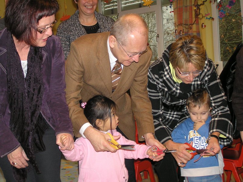 Bürgermeisterin Claudia Knoll, dem Dritten Bürgermeister Helmut Börner sowie einigen Fraktions- und Gruppensprechern des Stadtrats, die umgestalteten Räumlichkeiten der Kinderkrippe im Wartburgkindergarten. Die Räume befinden sich im Obergeschoss des Westflügels und wurden perfekt nach den Anforderungen einer modernen Kinderkrippe gestaltet. 160 singende Kinder hießen die Ehrengäste "Herzlich Willkommen", im Anschluss folgte die offizielle Eröffnung des rund 71 000 Euro Projekts.