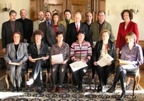Insgesamt 16 langjährig Beschäftigte bei der Stadt Memmingen standen am Montag im Rathaus zur Jubilarehrung an. Oberbürgermeister Dr. Ivo Holzinger (stehend, 4, von rechts) lobte in diesem Zusammenhang das große berufliche Engagement aller. Dieses und die langjährige Treue zur Stadt Memmingen seien Eckpfeiler auf welche die Stadtverwaltung baue. Mit der Bitte, in den bisherigen Anstrengungen nicht nachzulassen, überreichte der OB an alle Berufsjubilare eine Dankesurkunde und weitere Geschenke. Für 40 Jahre im Dienste der Stadt wurde Georg Küchle (Forstverwaltung) geehrt (stehend, 2. von rechts). Ausgezeichnet 25-jährige Treue wurden: Alfred Abt (Stadtwerke), Ute Dietrich (Kämmerei), Brigitte Fischer (Kindergarten Amendingen), Hans Guggenberger (Hochbau- und Bauordnungsamt), Bernd Kozik (Tiefbauamt), Thomas Langenwalter (Straßenverkehrsamt), Anna Rosa Rott (Realschule), Rainer Nusko (Rechtsamt). Dr. Barbara Schulz, Karin Rock, Elisabeth Pfeiler, Annemarie Lunitz, Marina Linse, Roger Kunrad und Karin Just (alle Klinikum)