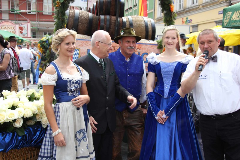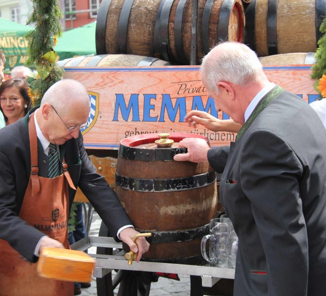Um kurz nach 11 Uhr zapfte Oberbürgermeister Dr. Ivo Holzinger das erste Bierfass am Brauereigespann der Memminger Brauerei an. Nach zwei Schlägen hieß es: O'zapft is! Zusammen mit dem Vorsitzenden der Werbegemeinschaft, Hermann Zelt, eröffnete das Memminger Stadtoberhaupt das 44. Memminger Stadtfest bei strahlendem Sonnenschein auf dem Marktplatz.