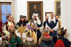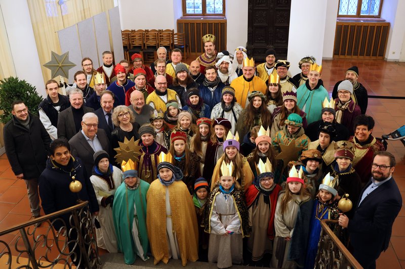 Sie sind seit Tagen in den prächtigen Gewändern der Heiligen Drei Könige in Memmingen unterwegs, haben Weihrauch, Lieder und Segenswünsche als Gaben dabei und sammeln Spenden für weltweite Kinderhilfsprojekte: Die Sternsingerinnen und Sternsinger der katholischen Pfarreiengemeinschaft Memmingen brachten den Segen für die Stadt auch ins Rathaus und wurden von Oberbürgermeister Jan Rothenbacher, Bürgermeisterin Margareta Böckh und Bürgermeister Dr. Hans-Martin Steiger herzlich empfangen. „Danke für euer tolles Engagement und dass ihr den Segen ins Rathaus bringt. Wir brauchen starken Segen für das Haus und für die Entscheidungen, die wir hier treffen“, betonte der Oberbürgermeister.