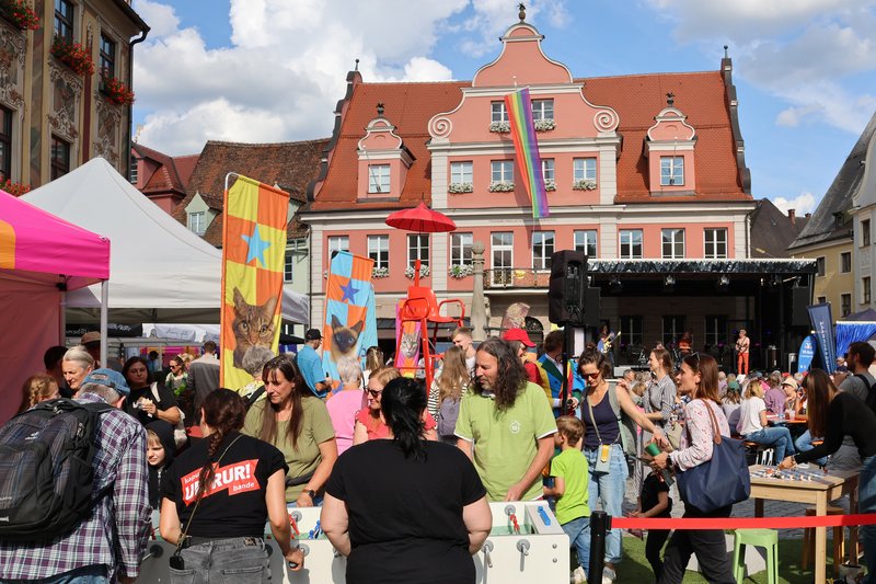 Wie hat es vor 500 Jahren in reichen Häusern gerochen? Wie kämpften die Bauern damals? Wie sah der Alltag der Bauernschaft und des Adels aus? Beim Open-Air-Event „Uffrur!... on the Road“ tauchten rund 2.100 Besucherinnen und Besucher auf dem Marktplatz ein in die Zeit des Jahres 1525. Der Marktplatz war geteilt in eine arme Hälfte der Bauernschaft und eine reiche Welt des Adels. Die Lebensumstände konnten an vielfältigen Spiel – und Kreativstationen erfahren und abends in einem temperamentvollen Musiktheater erlebt werden.