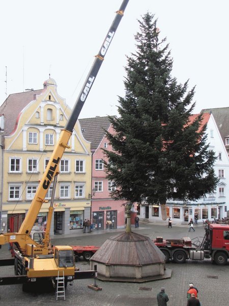 Dieses Jahr kommt der haushohe Baum direkt aus Memmingen, stammt er doch von einer Familie aus dem Nordweg. Im Laufe des Tages werden circa 400 Lichter angebracht.