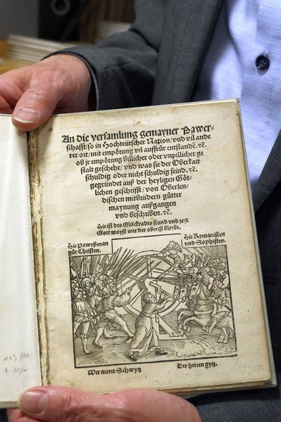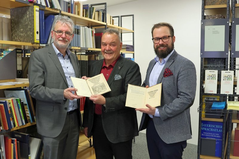Das Memminger Stadtarchiv konnte zwei für die Geschichte des Bauernaufstands von 1525 sehr bedeutende Flugschriften bei einer Auktion in München erwerben. Stadtarchivar Christoph Engelhard präsentierte die beiden Schriften nun zum ersten Mal der Öffentlichkeit: „Diese Anschaffung ist ein Ereignis für uns!“ Der Erwerb konnte durch die finanzielle Unterstützung der Memminger Rotary Clubs erfolgen. Beim Termin bedankte sich Oberbürgermeister Jan Rothenbacher beim derzeitigen Präsidenten Matthis Goebel. „Diese Unikate sind unschätzbare Zeitdokumente, die wir nun als bleibende Werte für die Stadt Memmingen und unsere Nachkommen hier erhalten können“, betont der Rathauschef erfreut.