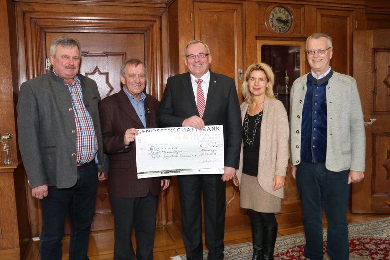 Die Vertreter der Vorstandschaft des Reservistenmusikzuges Jagdbombergeschwader 34 Memmingen Edmund Mikusch, 1. Vorsitzender, Reinhard Lohr, stellvertretender Vorsitzender und Martin Schorer, Organisator, freuten sich, bei einem Empfang im Rathaus eine Spende von 1.000 Euro an Oberbürgermeister Manfred Schilder und die Beauftragte für Städtepartnerschaften der Stadt Memmingen, Alexandra Hartge, zu übergeben. Im Rahmen des alljährlich von der Katholischen Landjugendbewegung (KLJB) Hawangen veranstalteten Soundcamps spielte der Reservistenmusikzug mit einem Benefizkonzert einen Betrag von 620 Euro ein. Diesen Betrag stockte die KLJB Hawangen um 380 Euro auf, so dass insgesamt 1.000 Euro für den nächsten Jugendaustausch zur Verfügung stehen.