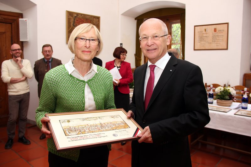 Mit einem Wechter-Stich, dem ältesten Stich der Stadt aus dem Jahr 1573, der die Tore und Türme Memmingens zeigt, bedankte sich der Rathauschef bei Ursula Knobl für die langjährige und erfolgreiche Zusammenarbeit.