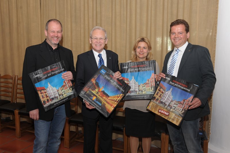 Oberbürgermeister Dr. Ivo Holzinger stellte gemeinsam mit der Stadtmarketing-Beauftragten Alexandra Störl, Thilo Frommlet, Inhaber der Fa. Gefro und Heribert Thanner vom gleichnamigen Fotostudio die neu herausgekommene „Memminger Stadttasche“ der Öffentlichkeit vor. Die Tasche zeigt auf einer Seite den Marktplatz bei Nacht mit Blick Richtung Martinskirche und dem Allgäu Logo. Auf der anderen Seite ist die „gute Stube“ Memmingens mit dem Rathaus und dem Stadtwappen zu sehen.