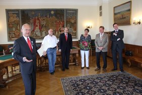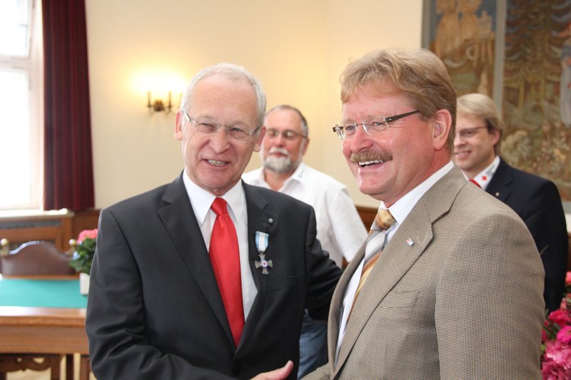 Die Parlamentarier Stephan Stracke und Dr. Paul Wengert vertraten bei der Ehrung im Sitzungssaal des Rathause Bundes- und Landtag, Bezirksrätin Petra Beer und Bürgermeister Helmut Börner die kommunale Ebene. Landtagsabgeordneter Dr. Paul Wengert, zugleich stellvertretender BRK-Präsident, berichtete aus seiner kommunalpolitischen Vergangenheit: „Der Beruf des Oberbürgermeisters kennt wie kein anderer Herausforderungen, auch zeitliche“. Daher sei es alle Ehre wert, darüber hinaus weitere Verantwortung im Roten Kreuz zu übernehmen. „Du bist Teil dieser großen Familie, Gratulation für diese verdiente Anerkennung“, so der BRK-Vize. Neben ihm hatten sich weitere zahlreiche Vorstandskollegen des BRK-Kreisverbandes und Kreisgeschäftsführer Wilhelm Lehner zur Ehrung eingefunden.