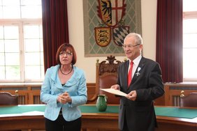 In ihrer Laudatio würdigte die Bürgermeisterin die Verdienste Dr. Holzingers für das Rote Kreuz, brach aber auch eine Lanze für das Ehrenamt. Zahlreiche Um- und Erweiterungsbauten sowie Sanierungen der Wachen Memmingen, Mindelheim, Babenhausen, Ottobeuren und Türkheim konnten neben verschiedenen Erweiterungen der Dienste unter der Ägide Dr. Holzingers verwirklicht werden. „Unser solidarisches Gemeinwesen kann nur weiterleben, wenn Leute Verantwortung übernehmen. Das Ehrenamt ist ein Geben, aber auch ein Geschenkt-Bekommen“, stellte Böckh heraus. Es bereichere die Persönlichkeit und man wachse daran, so die Bürgermeisterin weiter. Ihr Dank galt auch Holzingers ebenfalls anwesender Ehefrau Margrit. Nach dem Verlesen der Urkunde heftete Böckh dem Geehrten das Ehrenzeichen am Bande an das Revers. In seinen Dankesworten betonte Dr. Holzinger, dass er die Auszeichnung stellvertretend für alle ehrenamtlich Tätigen im hiesigen Kreisverband entgegennehme. „Der Anteil des Vorsitzenden ist die geringste Leistung“, so der BRK-Kreischef.