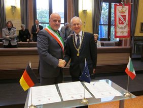 Gemeinsam mit den italienischen Freunden, darunter auch die ehemaligen Oberbürgermeister der Partnerstadt, wurden die vielen seitherigen bürgerschaftlichen Begegnungen gewürdigt, bei denen sich weit mehr als 6000 Bürgerinnen und Bürger im Rahmen der Partnerschaft getroffen hatten.
