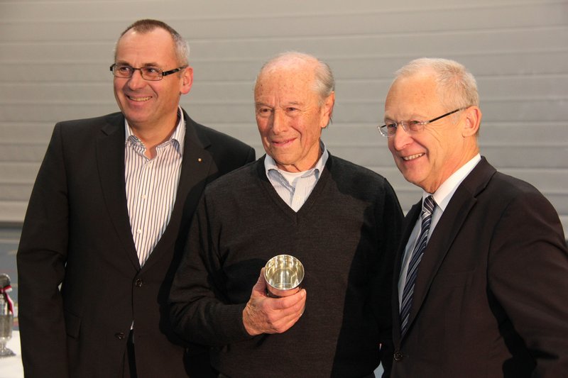 „Bevor wir die Sportlerinnen, Sportler und Mannschaften des Jahres 2011 auszeichnen möchte ich mit Werner Krafft ein „Urgestein“ des Turnvereins Memmingen ehren“, so Oberbürgermeister Dr. Ivo Holzinger nach der Begrüßung der Gäste. Krafft feierte kürzlich seinen 85. Geburtstag und ist seit 1947 Mitglied beim TVM. Über zehn Jahre war Krafft als Abteilungsleiter der Leichtathleten tätig und engagiere sich auch heute noch als Übungsleiter. „Über 30 Jahre half er dem Vorstand als Vermögensverwalter die Geschicke des Vereins zu führen“, so der Rathauschef und überreichte anschließend den Ehrenbecher der Stadt Memmingen für besondere Verdienste um den Sport an den Preisträger Werner Krafft.