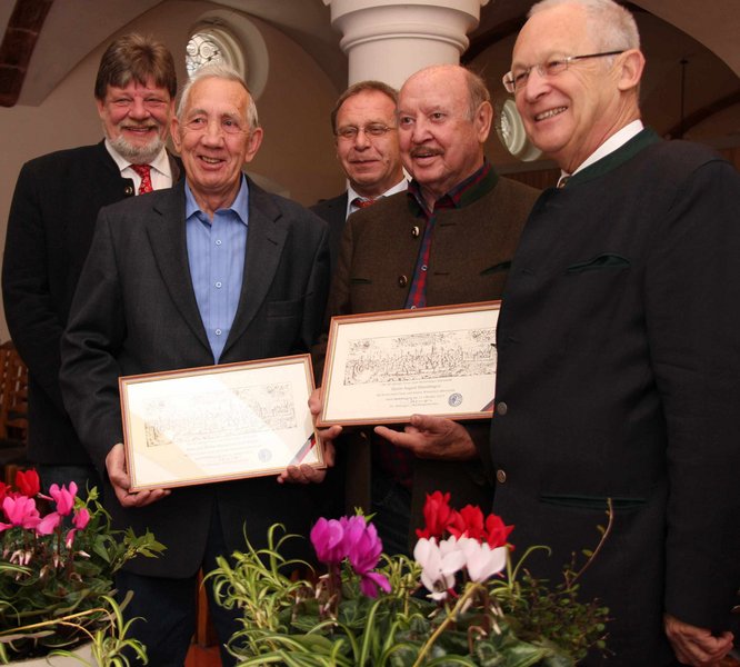 Für 40-jährige Treue zum Memminger Jahrmarkt wurden jetzt die beiden Schausteller August Ehrenbogen und Franz Josef Kaiser mit einem Stich der Stadt Memmingen von Oberbürgermeister Dr. Ivo Holzinger geehrt.