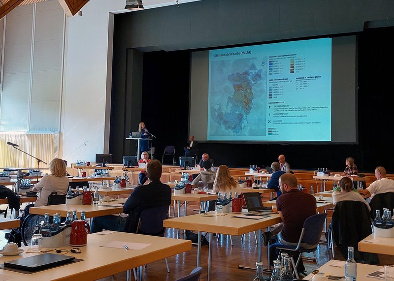 Mit der Erarbeitung des Stadtklimakonzeptes wurde ein externes Planerteam beauftragt: berchtoldkrass space & options zusammen mit bgmr Landschaftsarchitekten GmbH und GEO-NET Umweltconsulting GmbH. Dr. Martin Berchtold von berchtoldkrass space&options präsentierte gemeinsam mit Katja Mendzigall der GEO-NET Umweltconsulting GmbH die Ergebnisse der Stufe 1.