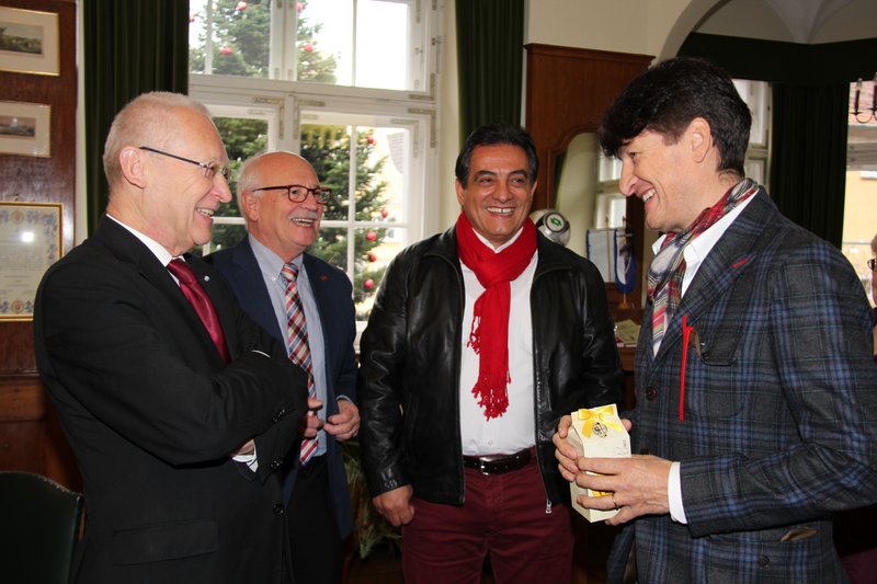 Andreas Fulterer dankte für die Einladung ins Rathaus und für die treue Unterstützung durch die Memminger. Er freue sich auf sein Konzert in der Stadthalle, bei dem er auch seine neue Weihnachtssingle "Jedes Kind ist heilig" präsentieren werde. Holzinger wünschte ihm weiterhin viel Erfolg und überreichte als Gastgeschenk den "Memminger Mau" gefüllt mit Konfekt.