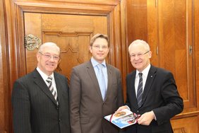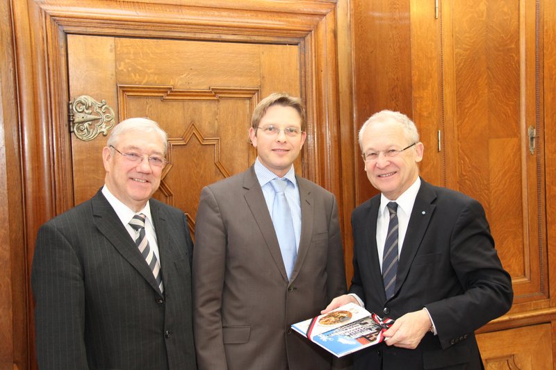 Gemeinsam mit dem heimischen Stimmkreisabgeordneten Staatsminister a. D. Josef Miller kam der neue Vorsitzende des Ausschusses für Hochschule, Forschung und Kultur im Bayerischen Landtag, Oliver Jörg, zu seinem ersten Antrittsbesuch bei einem Oberbürgermeister in das Memminger Rathaus. Hausherr Dr. Ivo Holzinger empfing seinen Gast im Amtszimmer zu einem kleinen Meinungsaustausch. Dr. Holzinger und Miller baten dabei einmütig um Unterstützung bei der Forderung nach einer staatlichen Hochschule für Memmingen. Memmingen als Oberzentrum sollte wie die Nachbarstädte eine entsprechende Einrichtung bekommen und nicht aufgrund der guten wirtschaftlichen Entwicklung zurückstecken müssen, so Dr. Holzinger. „Memmingen darf nicht abgehängt werden“, brachte es Miller auf den Punkt. Jörg gab sich für die Forderung offen: „Mein Herz schlägt für die Regionen“, bekannte der, wie der Oberbürgermeister, gebürtige Aalener, der den Stimmkreis Würzburg-Stadt im Landtag vertritt. Weiterer Inhalt der Unterredung waren die veränderten Anforderungen an die Wissensgesellschaft. Die Verzahnung zwischen Forschung, Lehre und Wirtschaft werde immer wichtiger, berichtete Jörg aus seiner Arbeit im Landtag.