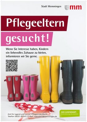 Stets ist das Stadtjugendamt Memmingen auf der Suche nach engagierten Menschen, die sich vorstellen können, ein Kind oder eine/n Jugendliche/n kurzfristig oder auf Dauer aufzunehmen. Eine bestimmte Ausbildung ist nicht notwendig – wichtig sind Engagement und ein „großes Herz“. Die Pflegemütter und –väter werden vom Pflegekinderdienst des Stadtjugendamtes pädagogisch begleitet und auf die Tätigkeit in einem Qualifizierungskurs vorbereitet. Sie erhalten für ihr Engagement ein angemessenes Entgelt. Auch mittels einer Plakatkampagne im Memminger Stadtgebiet werden derzeit Pflegeeltern gesucht. Die Mitarbeiterinnen des Pflegekinderdienstes, Alena Bottos und Ariane Lässle, sind für unverbindliche Auskünfte unter Tel. 08331/850-458 bzw. -459 sowie per E-Mail unter alena.bottos(at)memmingen.de bzw. ariane.laessle(at)memmingen.de zu erreichen.