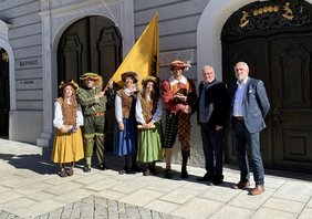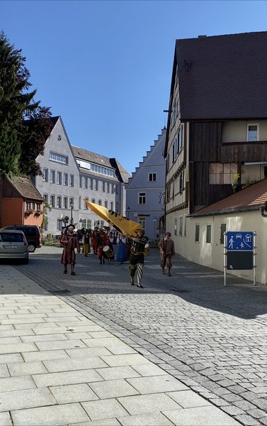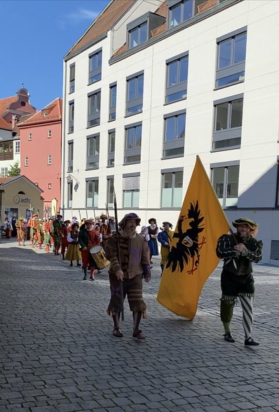 Mit der Musik von Flöten und Trommeln zog das bunte Landsknechtsfähnlein der freien Reichsstadt Memmingen vor das Rathaus. Der Bitte des Hauptmanns Michael Karrer nach Send- und Geleitbriefen für sich und seinen „Haufen“, kam der Schultheiß der ehemals freien Reichsstadt gerne nach. Auch Geschenke entbot Manfred Schilder den Kollegen in Erkheim und Mindelheim. „Für die schon mehrere Male gewähret Gastung unserer tapferen Mannen und ihrer nicht minder gefürchteten Weiber- und Kinderschar, lassen wir gar herzliche Gruß- und Dankesworte überbringen“, übersandte Schilder im Brief an die Erkheimer, die dem Fähnlein auf dem Weg durchs Unterallgäu wie schon die Jahre zuvor eine Übernachtungsmöglichkeit boten. Nachbarliche Grüße gab es auch an die freien Räte und Schultheiß von Mindelheim: „Aus dem Grunde einer guten und tiefen Verbundenheit mit eben dieser Herrschaft, möchten Rat und Schultheiß unseren Mindelheimer Nachbarn die pflicht-schuldigste Referenz zu Teil werden lassen.“