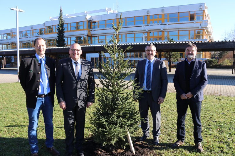 Den Sommer über wurde die kleine Fichte im städtischen Gartenamt gehegt und gepflegt, jetzt hat sie vor dem Berufsbildungszentrum (BBZ) ihren festen Standort gefunden: Der „Baum der Zukunft“, den Wirtschaftsministerin Ilse Aigner anlässlich der Berufsmeile „Berufliche Bildung – Deine Chance“ im Mai in der Stadthalle an Oberbürgermeister Manfred Schilder überreicht hat, wurde nun gepflanzt. „Möge der Baum der Bildung in Memmingen wachsen und gedeihen“, wünschte der Oberbürgermeister auch im übertragenen Sinne. Gemeinsam mit Schulamtsdirektor Bertram Hörtensteiner, Vorsitzender des Arbeitskreises Schule-Wirtschaft, der die Berufsmeile gemeinsam mit dem Wirtschaftsministerium organisiert hatte, mit BBZ-Schulleiter Albert Spitzner und Gartenbauamtsleiter Rudolf Schnug brachte der Oberbürgermeister neben dem Baum ein Schild an, das dessen Herkunft aus dem Wirtschaftsministerium erklärt.